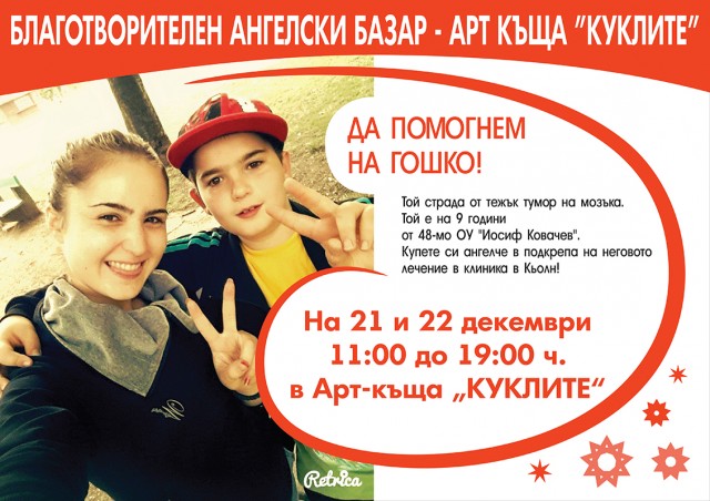 Благотворителният ангелски конкурс на Арт-Къща „Куклите” събра 4240 лв за Гошко. Над 300 ангела бяха продадени в кампанията, провела се на 21 и 22 декември. Благодарение на медиите (БНТ и Нова тв), които отправиха апела на децата, участвали в конкурса „Виж моя ангел”: „Да помогнем на Гошко!”, много хора с добри сърца се отзоваха и в навечерието на Коледа си купиха ангелчета. Сред подкрепилите каузата бяха дори тв журналиста Живко Константинов, който подготви репортажа за новините на Нова тв, хора от екипа на Вицепрезидента Маргарита Попова, екипът на Арт-Къща „Куклите” и много техни приятели. Благодарим на строителната фирма, която закупи ангели за 1200 лв, както и на анонимния дарител (строител, който бе дошъл с работни дрехи), който остави 600 лв за едно ангелче. Куклите имаха цени от 5, 10, 15, 20 и 25 лв, но всеки можеше да остави колкото прецени. Благодарим на всички хора, които подкрепиха инициативата! И най-вече на децата, които изработиха с много топлота и чистота белите създания с тази благородна мисия – да помогнат на едно страдащо дете.