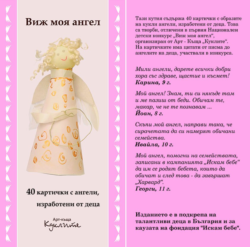 Кокетната кутийката съдържа 40 оригинални картички с образите на кукли-ангели, изработени от деца. Куклите са отличени в Националния детски конкурс „Виж моя ангел”, организиран от Арт-Къща „Куклите” под патронажа на Вицепрезидента на РБългария. На гърба на всяка картичка има кратки цитати от писма до ангелите, от деца, участвали в конкурса.